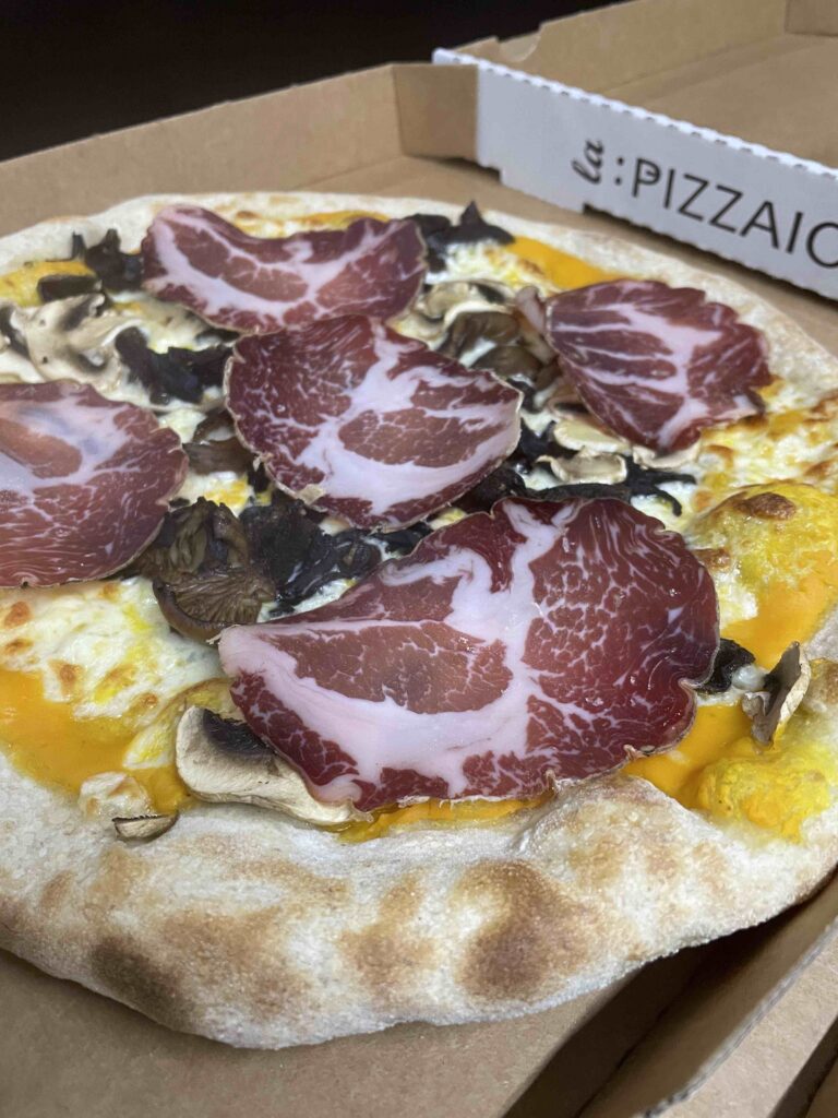 Pour ce mois d’octobre, vous retrouvez comme d’habitude la Forestière. Elle se compose d’une crème de potimarron, de mozzarella, d’une poêlée de champignon et de coppa, un grand classique du camion !