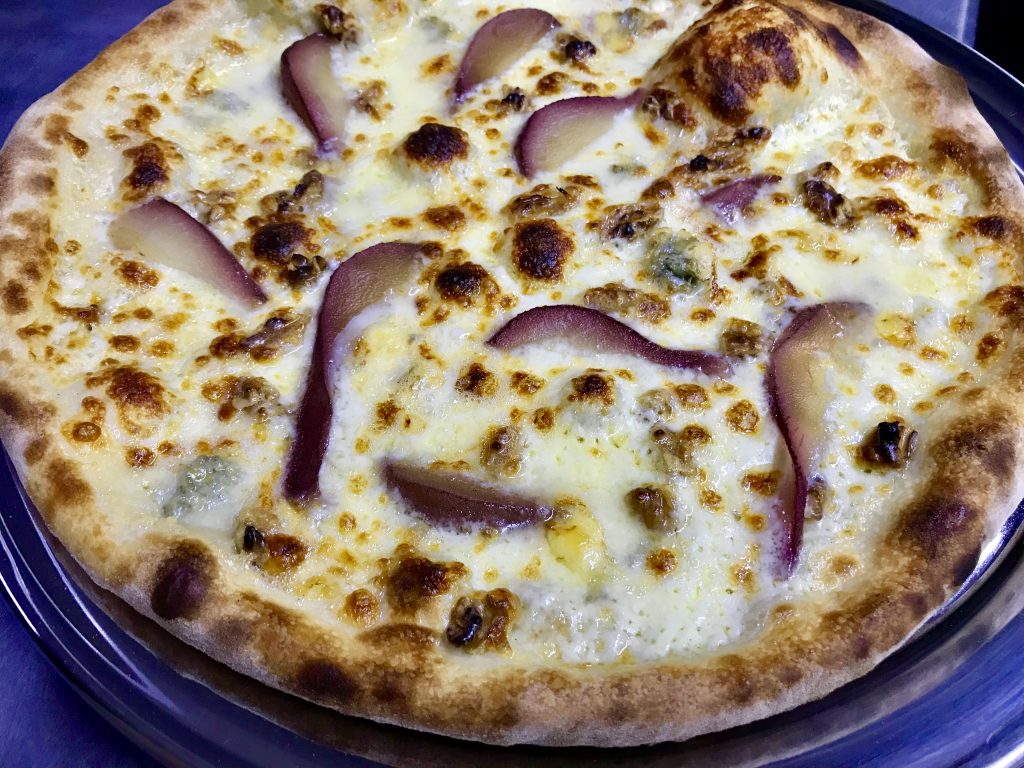 Pour cette deuxième semaine de décembre, retrouvez la Piémontaise. Elle se compose de crème fraiche, de mozzarella, de gorgonzola, de poire pochée au vin rouge et de noix