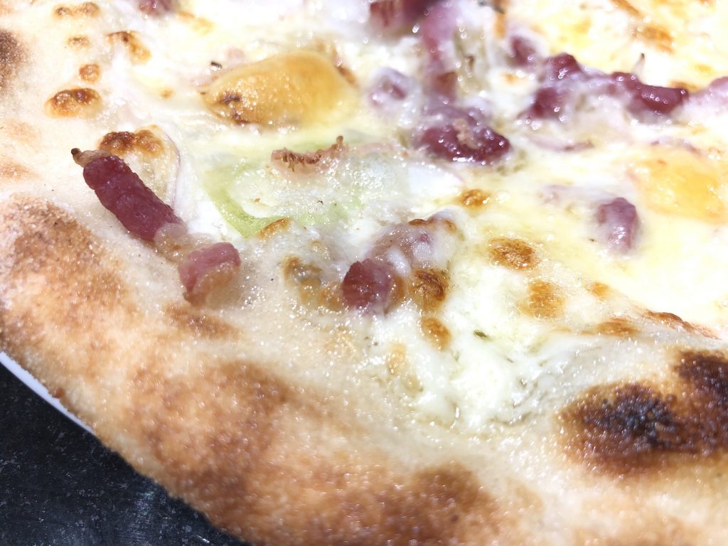 Pour ce mois de novembre, vous retrouvez la Vosgienne. Elle se compose de crème fraiche, de mozzarella, de munster, de lardons, d’oignon et de cumin.